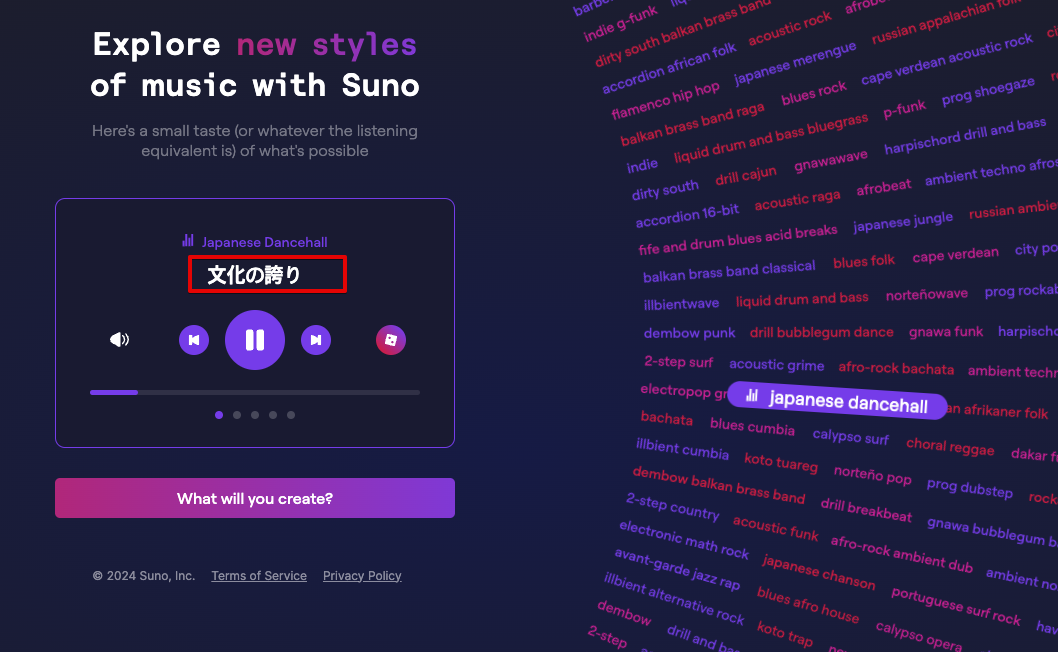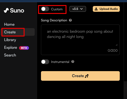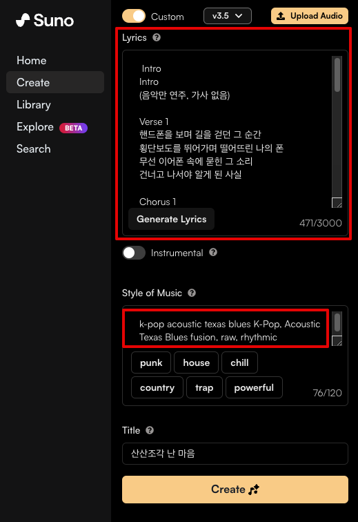 Suno 의 좌측 메뉴에 Create 로 들어가보면, 입력하는 부분이