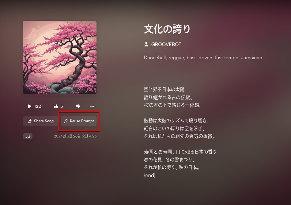 해당 스타일세트를 추출해낸 곡의 상세가 표시되고, 유사한 Style 을 얻고싶으면 "reuse prompt" 를 눌러 나의 새로운 곡을 만들어낼 수 있습니다.
